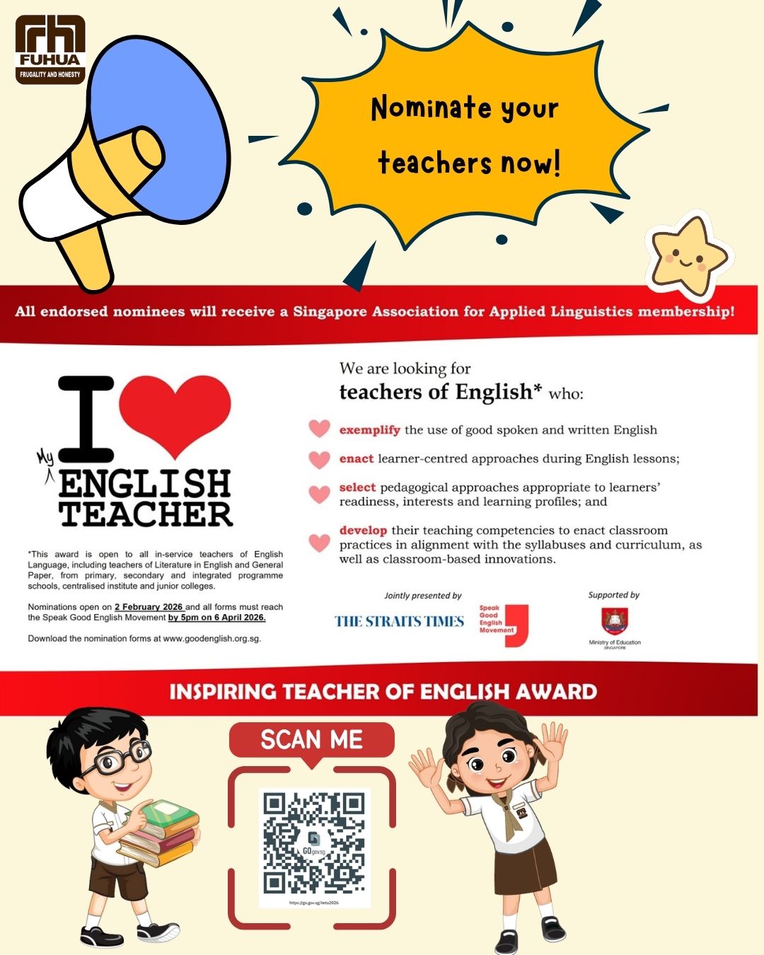 Your nomination is more than just recognition - it's an affirmation and encouragement to the teachers who work tirelessly to help our students excel in English. Let's honour those who inspire excellence every day!