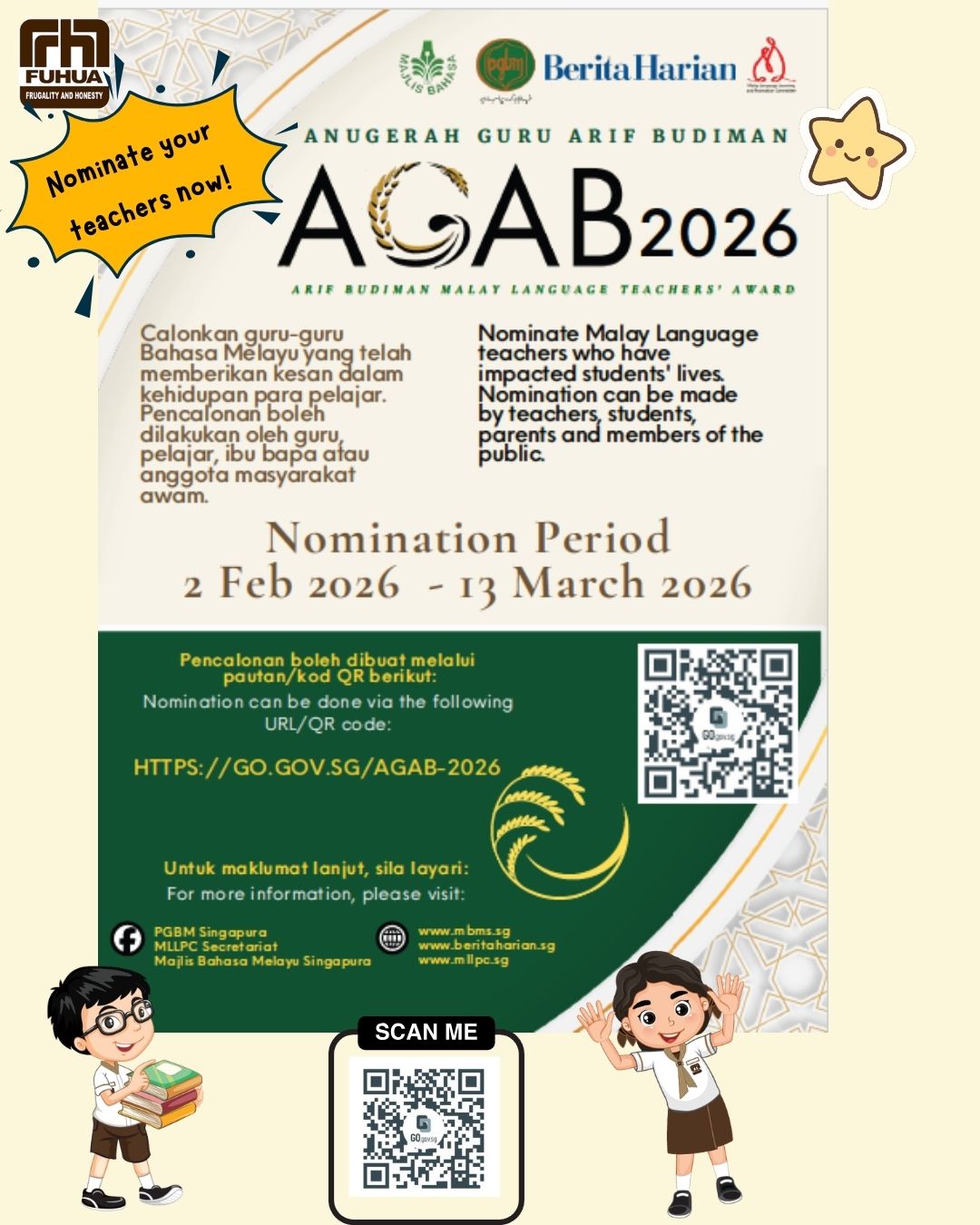 We would like to invite students and parents to nominate Malay Language teachers from our school for the awards, as an affirmation and encouragement to them.